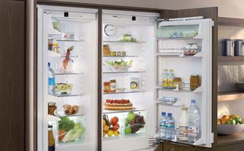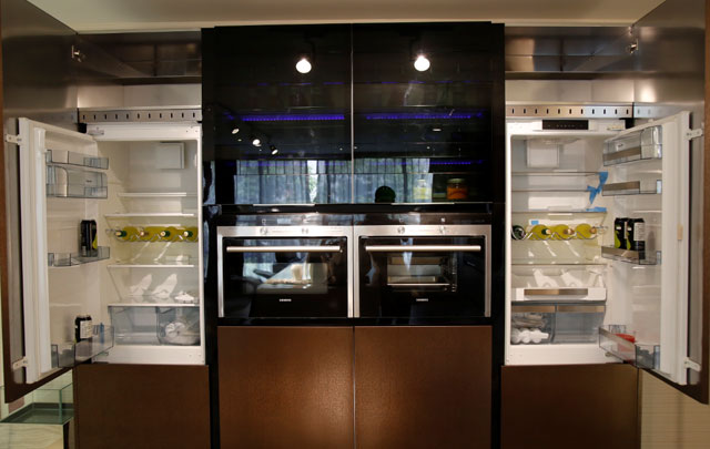 两台冰箱对称设计,设置在柜体里面,既和柜体有整体性,又能够满足厨房冷藏、储存功能。