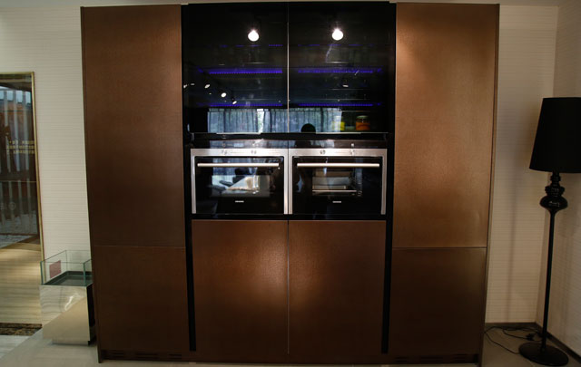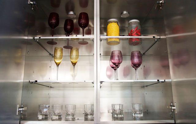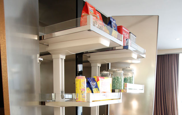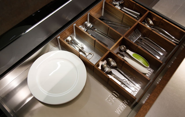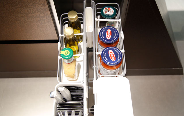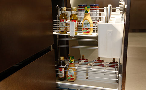 采用格拉斯的电动超薄抽屉,起步承重40kg,轻轻触碰即可弹出,在手上不方便的时候可以用膝盖。在抽屉里又设置了抽屉,使空间得到最大化的利用。收纳,取出都非常方便,生活更加精致。