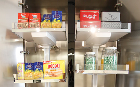 采用凯斯宝玛擎天柱,双缓冲,推进去拉出来都有缓冲,物品分类摆放,找东西很方便,储物更加方便。无极调节,高矮可自行调节,操作更简单。