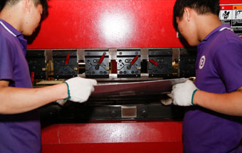 此环节通过数控折弯机将刨槽完毕的不锈钢板折出90度直角,看似简单的操作,却需要两名三年以上岗位工龄的熟练技师配合默契方能完成。折弯角度、尺寸规合考验的是操作员的责任心与熟练度,法迪奥追求工匠精神,在此环节得到了充分呈现,而后,经内部质检合格,进入下一流程。
