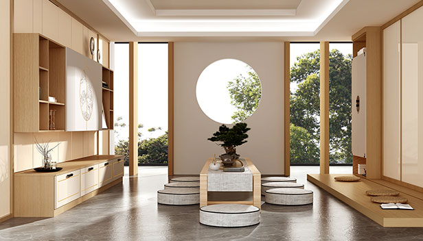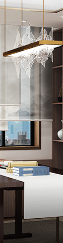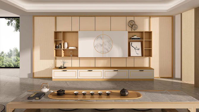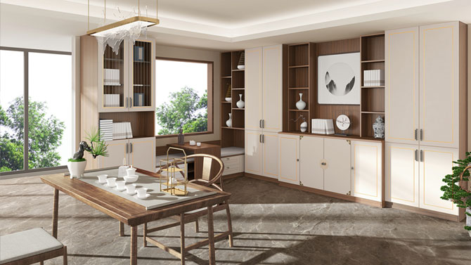 静悦雾语是华帝家居新中式全屋系列产品的代表作,包含入户、厨房、餐厅、客厅、卧室、书房、阳台、儿童房共8个单元产品, 门板为白色吸塑中式造型,金色装饰线条,搭配雕刻有鱼水纹图腾的铜制角花圆片,镶嵌中式韵味的拉手,寓意吉祥如意。 同时提炼传统古画山水的经典元素,杂糅进现代家居设计中, 以现代人的审美需求来打造富有传统韵味的家居,新中式+轻奢,古典风格与现代元素的融合,可衍生出无数格调高雅,简约大气的新中式风格。